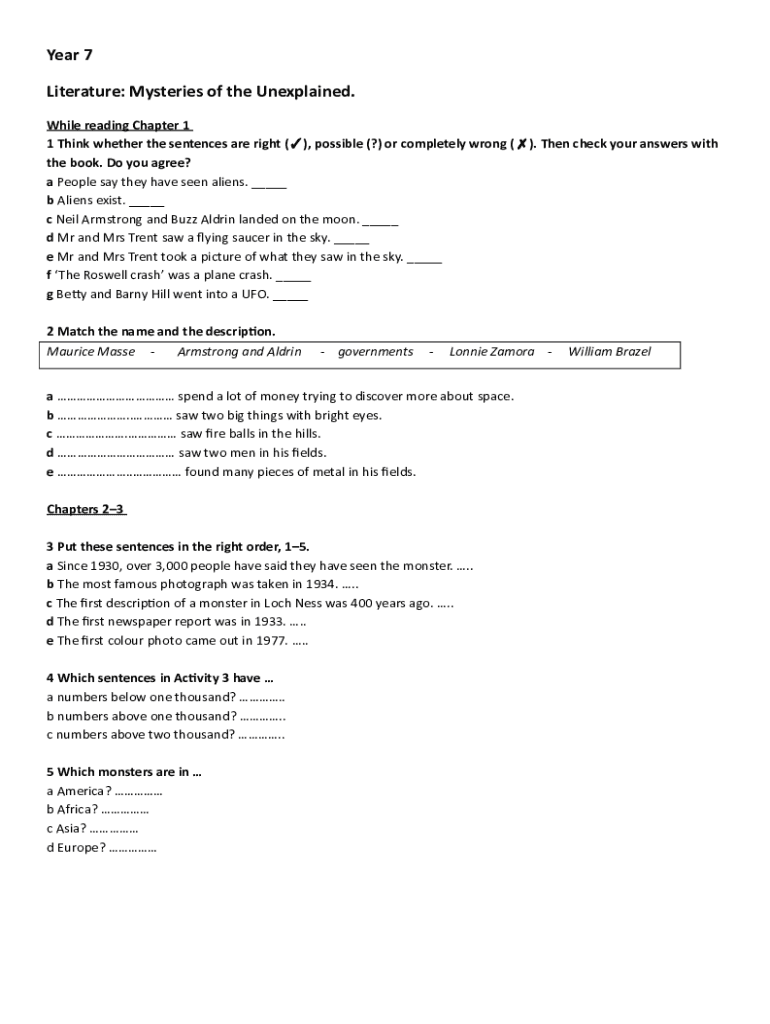 Year 7 Literature: Mysteries of the Unexplained. While reading Chapter 1 1 Think whether the sentences are right (), possible (?) or completely wrong (). Then check your answers with the book. Do