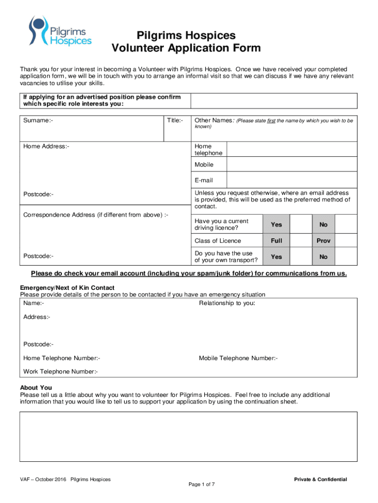 Pilgrims Hospices Volunteer Application Form Thank you for your interest in becoming a Volunteer with Pilgrims Hospices. Once we have received your completed application form, we will be in touch