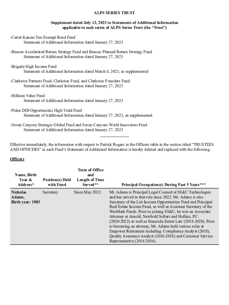 ALPS SERIES TRUST Supplement dated July 12, 2023 to Statements of Additional Information applicable to each series of ALPS Series Trust (the Trust) Carret Kansas TaxExempt Bond Fund Statement of Additional