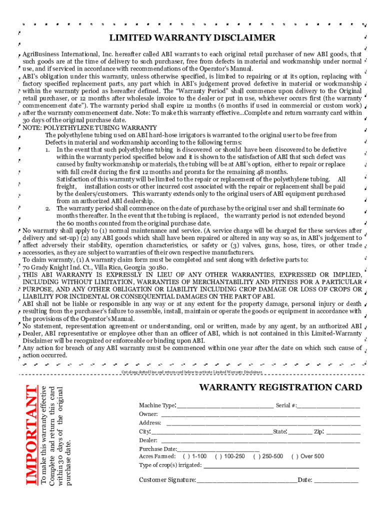 Agribusiness International, Inc. hereafter called ABI warrants to each original retail purchaser of new ABI goods, that