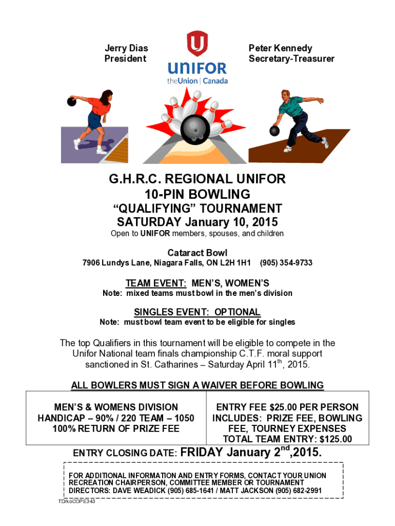 Jerry Dias PresidentPeter Kennedy SecretaryTreasurerG.H.R.C. REGIONAL UNIFOR 10PIN BOWLING QUALIFYING TOURNAMENT SATURDAY January 10, 2015 Open to UNIFOR members, spouses, and childrenCataract Bowl