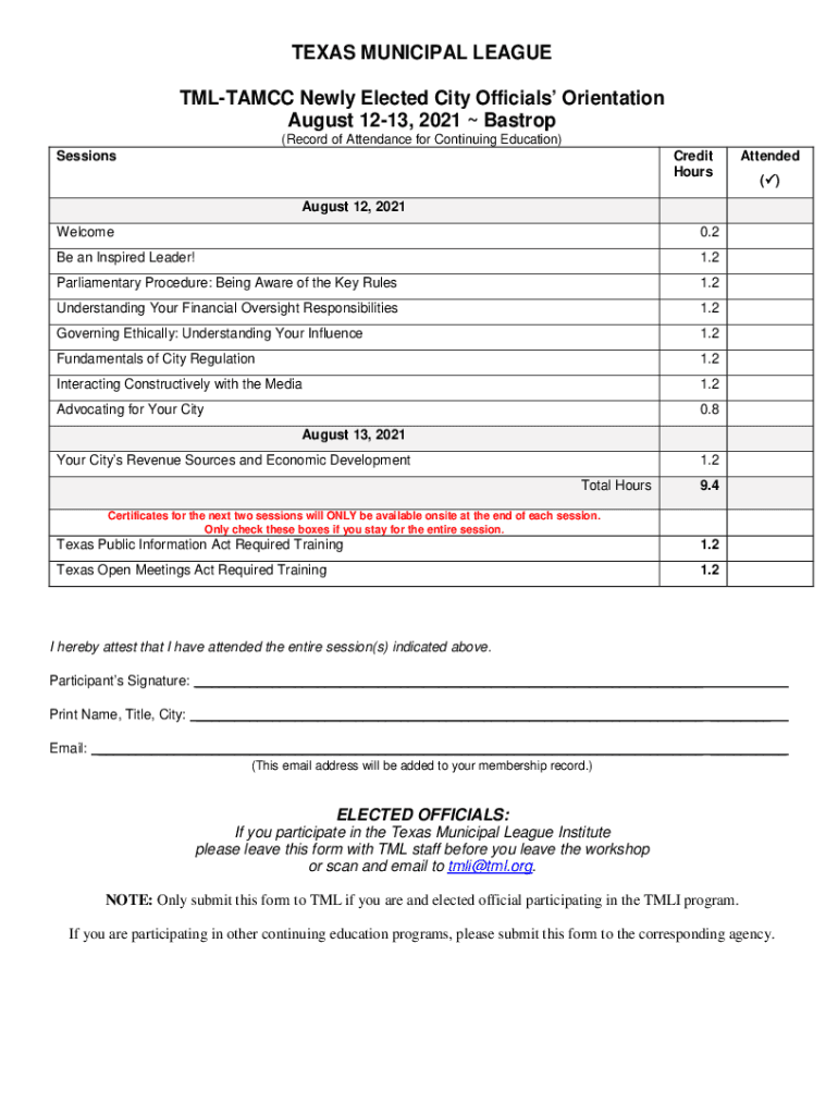 TEXAS MUNICIPAL LEAGUE TMLTAMCC Newly Elected City Officials Orientation August 1213, 2021 Bastrop (Record of Attendance for Continuing Education)SessionsCredit HoursAttended ()August 12, 2021 Welcome0.2Be