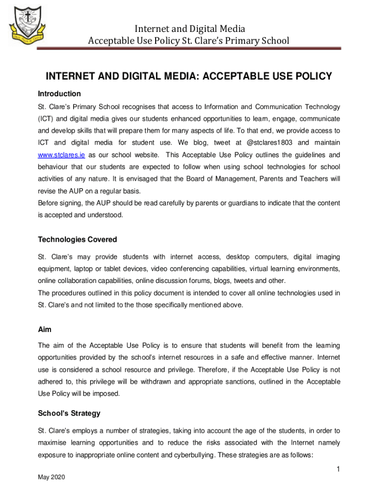 Internet and Digital Media Acceptable Use Policy St. Clares Primary SchoolINTERNET AND DIGITAL MEDIA: ACCEPTABLE USE POLICY Introduction St. Clares Primary School recognises that access to Information