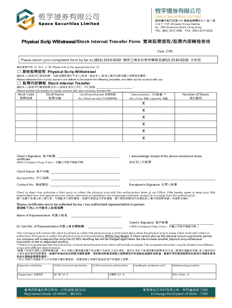 Physical Scrip Withdrawal/Stock Internal Transfer Form / Date :Please return your completed form by fax to (852) 2510 0220 (852) 2510 0220 Please tick at the appropriate box Physical Scrip Withdrawal///