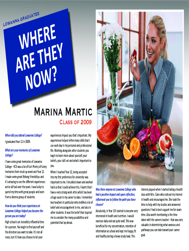 ATESGRADU A N N LOWAE R E WH EY H T E AR ? W NO Marina Martic Class of 2009When did you attend Lowanna College? I graduated Year 12 in 2009. What are your memories of Lowanna College? I have some