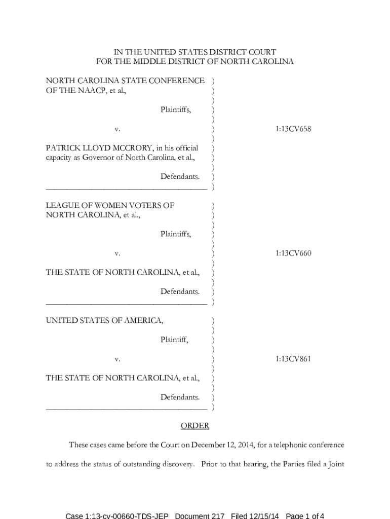 IN THE UNITED STATES DISTRICT COURT FOR THE MIDDLE DISTRICT OF NORTH CAROLINA NORTH CAROLINA STATE CONFERENCE ) OF THE NAACP, et al., ) ) Plaintiffs, ) ) v. ) ) PATRICK LLOYD MCCRORY, in his official