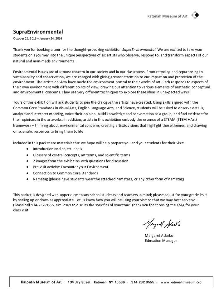 Katonah Museum of ArtSupraEnvironmental October 25, 2015 January 24, 2016Thank you for booking a tour for the thoughtprovoking exhibition SuperEnvironmental. We are excited to take your students on
