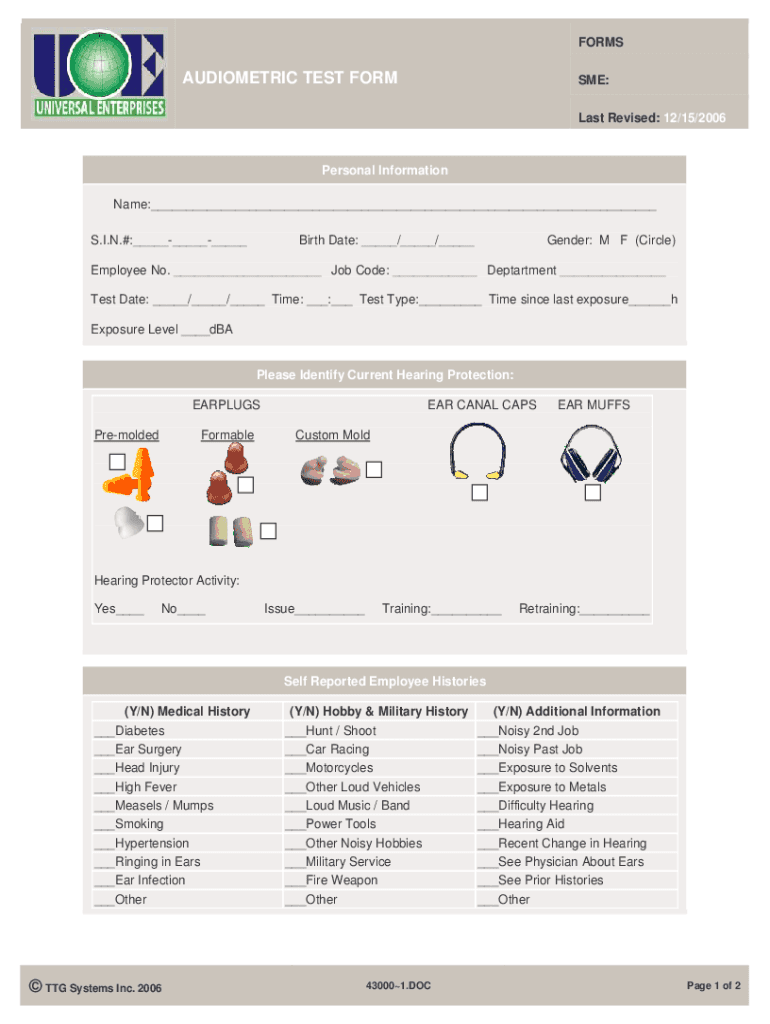 FORMSAUDIOMETRIC TEST FORMSME: Last Revised: 12/15/2006Personal Information Name:___ S.I.N.#:_________Birth Date: ___/___/___Gender: M F (Circle)Employee No. ___ Job Code: ___ Deptartment ___ Test
