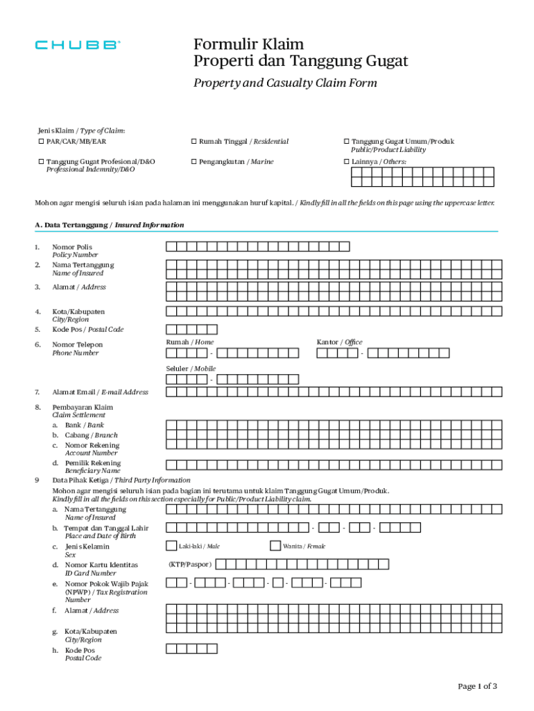 Formulir KlaimProperti dan Tanggung Gugat Property and Casualty Claim FormJenis Klaim / Type of Claim: o PAR/CAR/MB/EARo Rumah Tinggal / Residentialo Tanggung Gugat Umum/Produk Public/Product Liabilityo