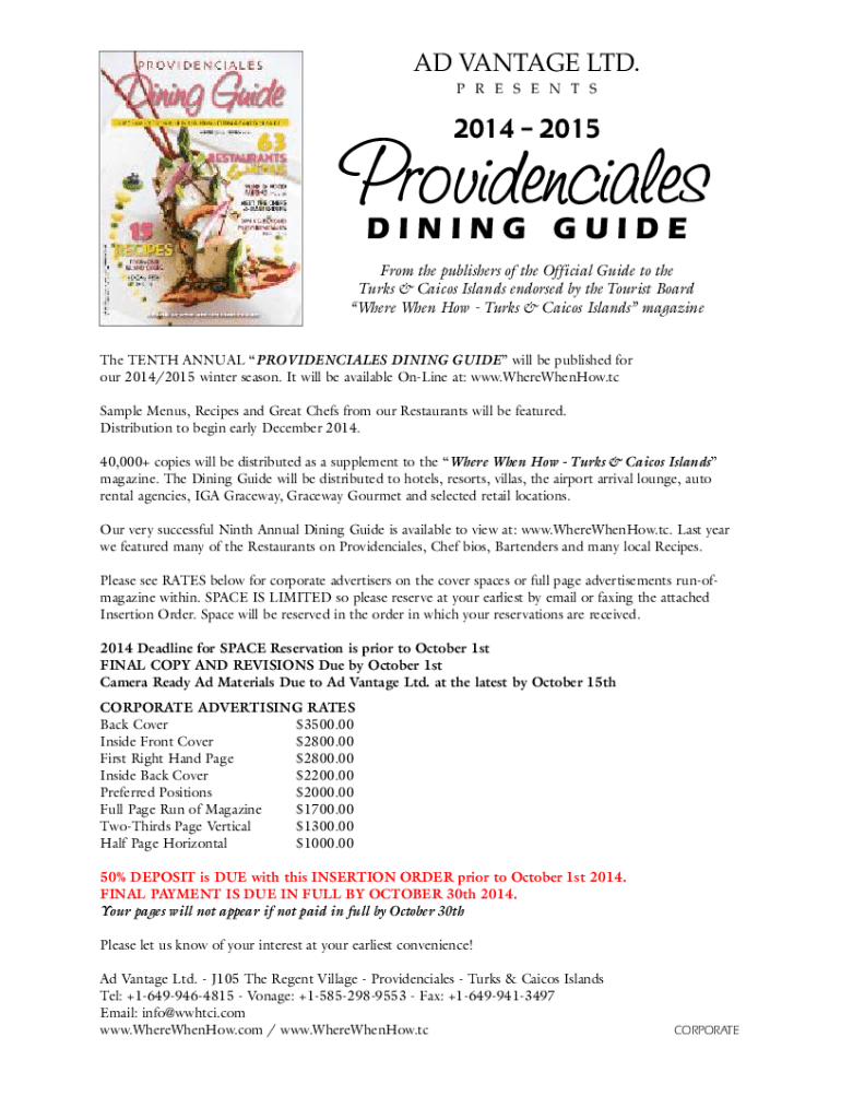 AD VANTAGE LTD. P R E S E N T S2014 2015Providenciales DINING GUIDEFrom the publishers of the Official Guide to the Turks & Caicos Islands endorsed by the Tourist Board Where When How Turks & Caicos