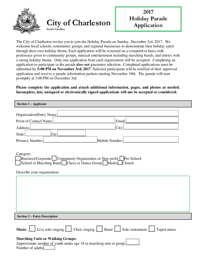 2017 Holiday Parade ApplicationCity of Charleston South CarolinaThe City of Charleston invites you to join the Holiday Parade on Sunday, December 3rd, 2017. We welcome local schools, community groups,