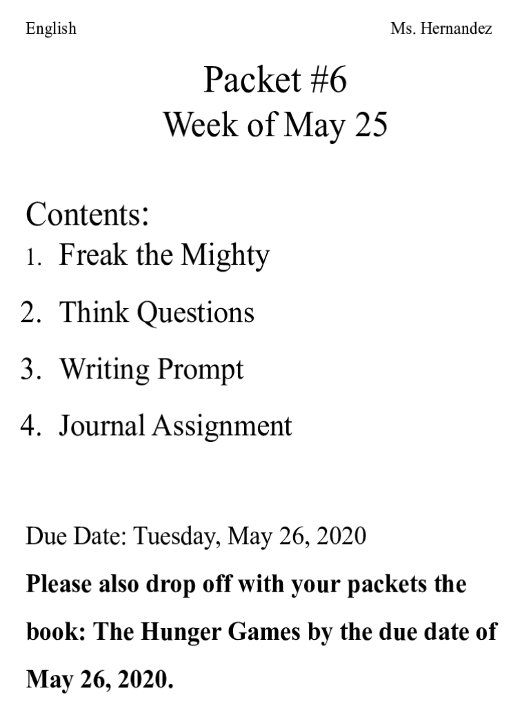 EnglishMs. HernandezPacket #6 Week of May 25 Contents: 1.Freak the Mighty2. Think Questions 3. Writing Prompt 4. Journal AssignmentDue Date: Tuesday, May 26, 2020 Please also drop off with your packets