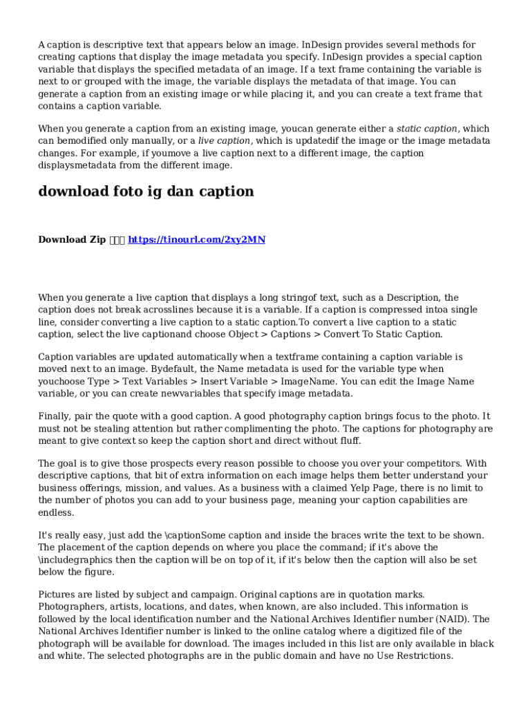 A caption is descriptive text that appears below an image. InDesign provides several methods for creating captions that display the image metadata you specify. InDesign provides a special caption