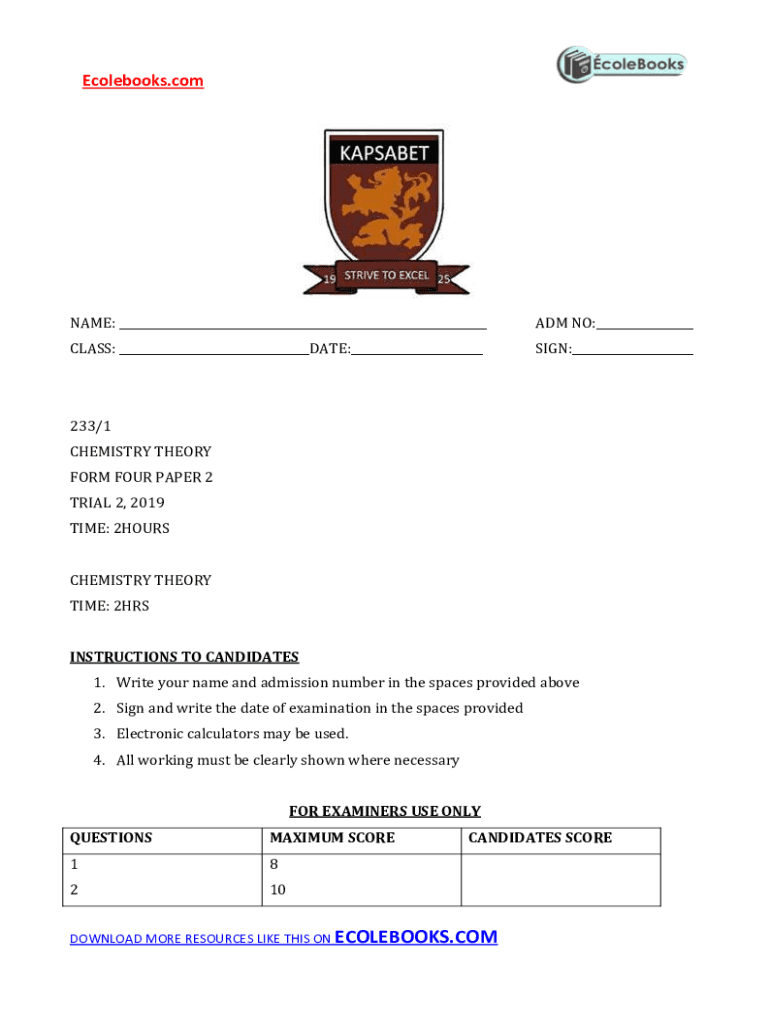 Ecolebooks.comNAME: ___ADM NO:___CLASS: ___DATE:___SIGN:___233/1 CHEMISTRY THEORY FORM FOUR PAPER 2 TRIAL 2, 2019 TIME: 2HOURS CHEMISTRY THEORY TIME: 2HRS INSTRUCTIONS TO CANDIDATES 1. Write your