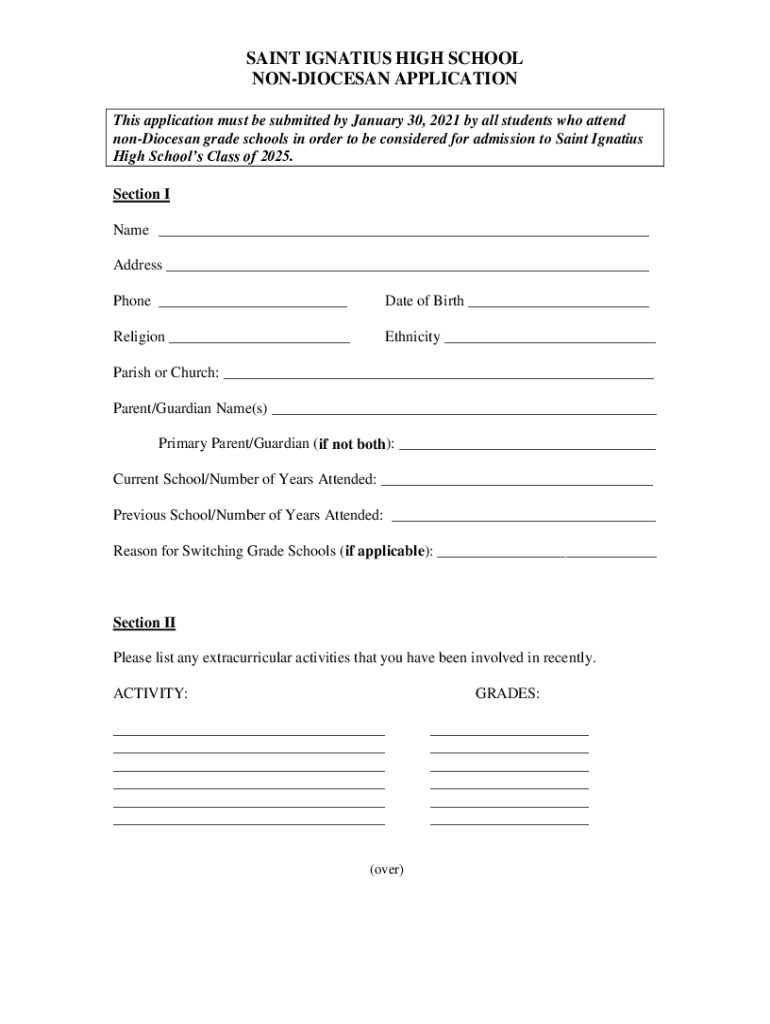 SAINT IGNATIUS HIGH SCHOOL NONDIOCESAN APPLICATION This application must be submitted by January 30, 2021 by all students who attend nonDiocesan grade schools in order to be considered for admission