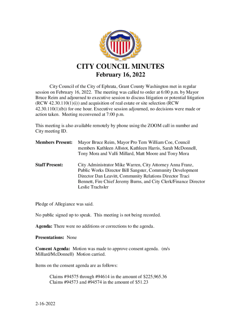 CITY COUNCIL MINUTES February 16, 2022 City Council of the City of Ephrata, Grant County Washington met in regular session on February 16, 2022. The meeting was called to order at 6:00 p.m. by Mayor