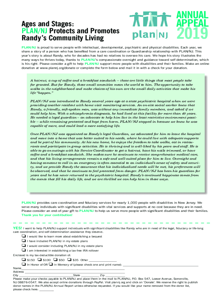 APPEAL2019PLAN/NJ is proud to serve people with intellectual, developmental, psychiatric and physical disabilities. Each