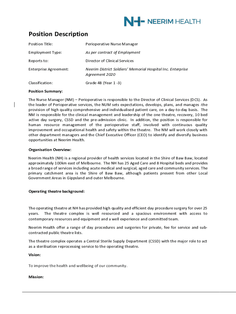 Position Title:Perioperative Nurse ManagerEmployment Type:As per contract of EmploymentReports to:Director of Clinical Services Enterprise Agreement:Nee rim District Soldiers