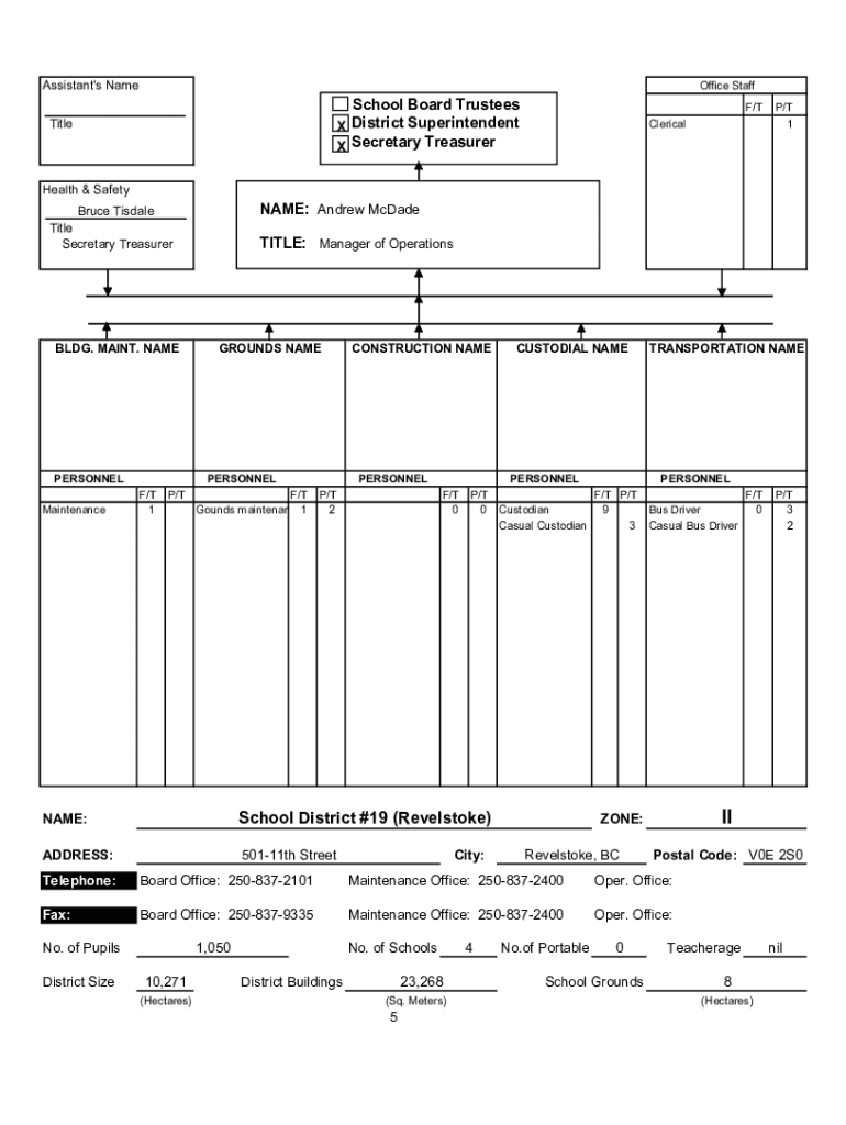 Assistant\'s NameOffice StaffSchool Board Trustees District Superintendent X Secretary Treasurer XTitleF/T ClericalP/T 1Health & SafetyNAME: NAME:Andrew McDadeBruce Tisdale Title Secretary TreasurerBLDG.