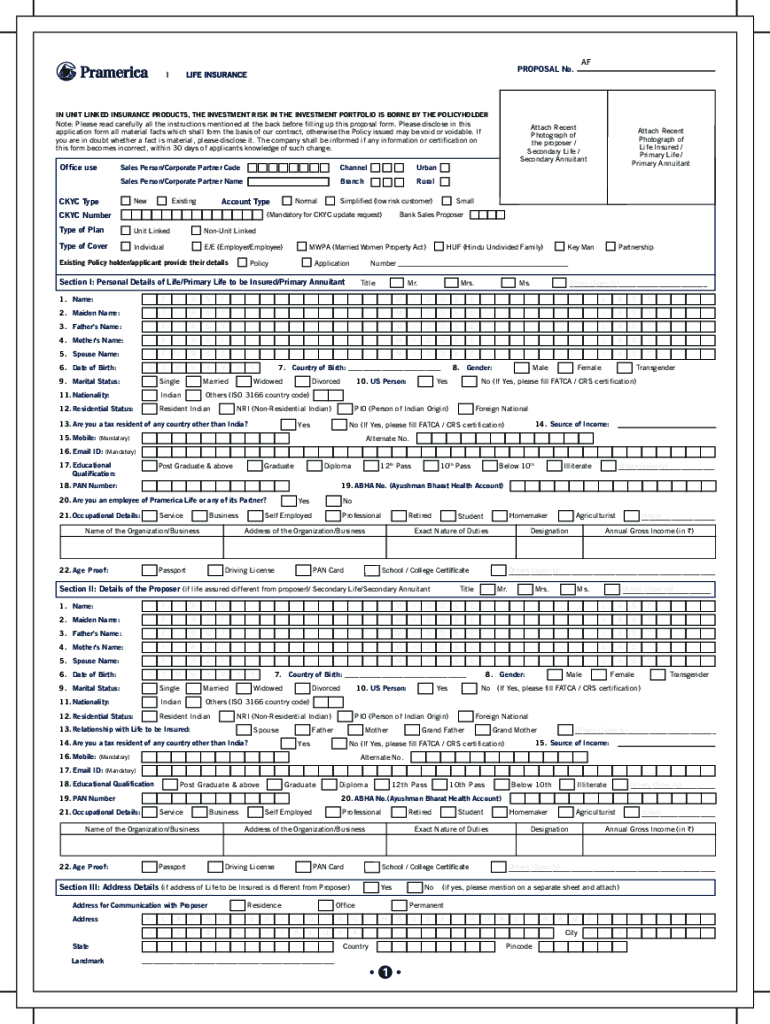 PROPOSAL No.IN UNIT LINKED INSURANCE PRODUCTS, THE INVESTMENT RISK IN THE INVESTMENT PORTFOLIO IS BORNE BY THE POLICYHOLDERNote: Please read carefully all the instructions mentioned at the back before