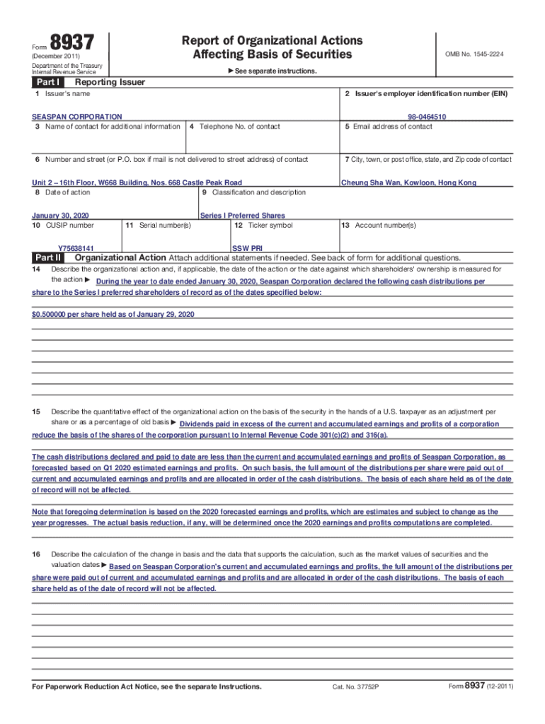 8937Report of Organizational Actions Affecting Basis of SecuritiesForm (December 2011) Department of the Treasury Internal Revenue ServicePart Ia Seeseparate instructions.Reporting Issuer1 Issuer\'s