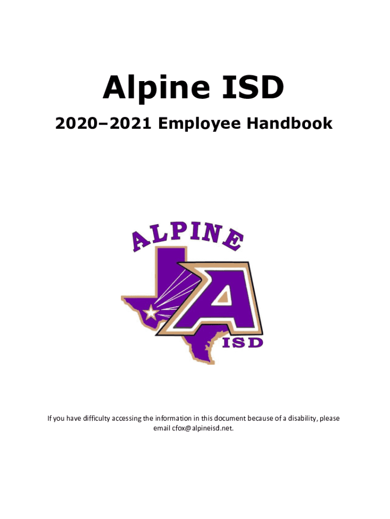 Alpine ISD 20202021 Employee HandbookIf you have difficulty accessing the information in this document because of a disability, please email cfox@alpineisd.net.Table of Contents Employee Handbook