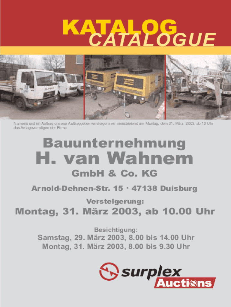 KATALOGCATALOGUENamens und im Auftrag unserer Auftraggeber versteigern wir meistbietend am Montag, dem 31. Mrz 2003, ab 10 Uhr das Anlagevermgen der FirmaBauunternehmungH. van Wahnem GmbH & Co. KG