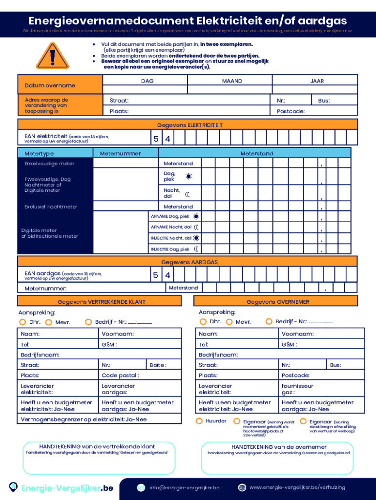 Energieovernamedocument Elektriciteit en/of aardgasDit document dient om de meterstanden te noteren. Te gebruiken in geval van: een verhuis, verkoop of verhuur van een woning, een echtscheiding, overlijden
