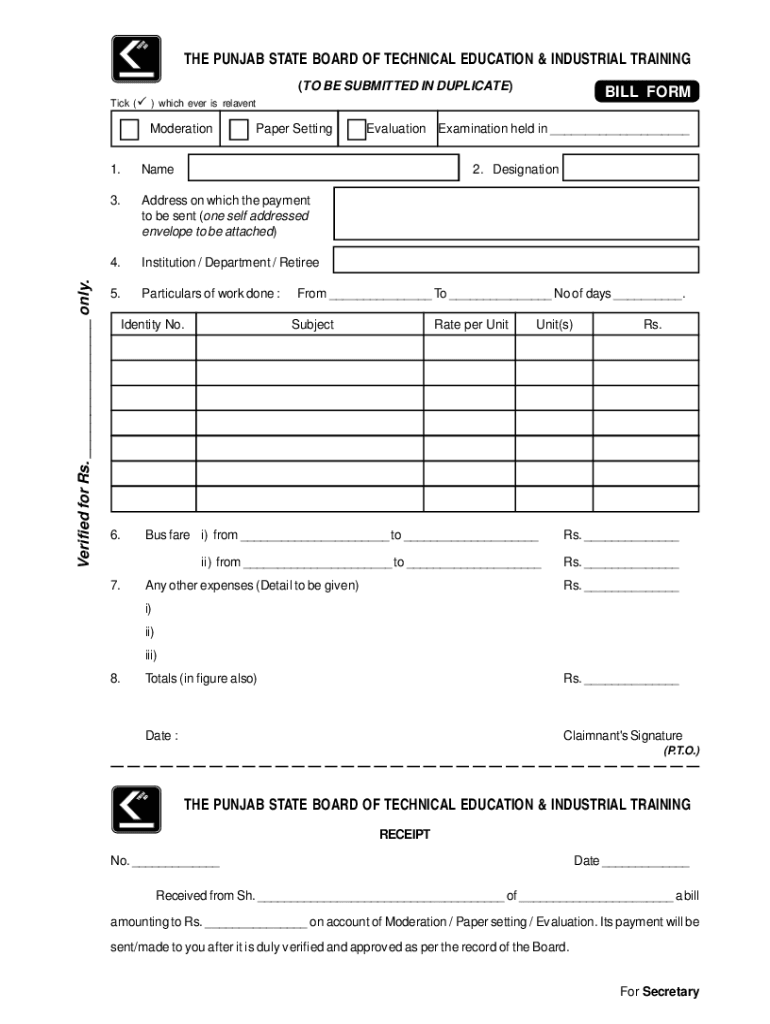 THE PUNJAB STATE BOARD OF TECHNICAL EDUCATION & INDUSTRIAL TRAINING (TO BE SUBMITTED IN DUPLICATE)BILL FORMTick ( ) which ever is relaventVerified for Rs. ___ only.ModerationPaper Setting1.Name3.Address