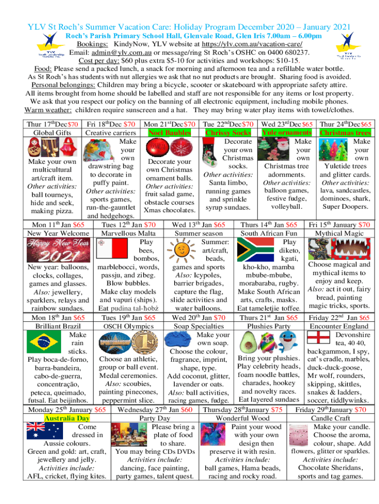 YLV St Rochs Summer Vacation Care: Holiday Program December 2020 January 2021 St Rochs Parish Primary School Hall, Glenvale Road, Glen Iris 7.00am 6.00pm Bookings: KindyNow, YLV website at https://ylv.com.au/vacationcare/