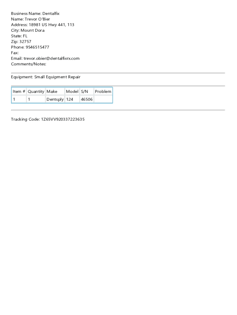 Business Name: Dentalfix Name: Trevor O\'Bier Address: 18981 US Hwy 441, 113 City: Mount Dora State: FL Zip: 32757 Phone: 9546515477 Fax: Email: trevor.obier@dentalfixrx.com Comments/Notes: Equipment:
