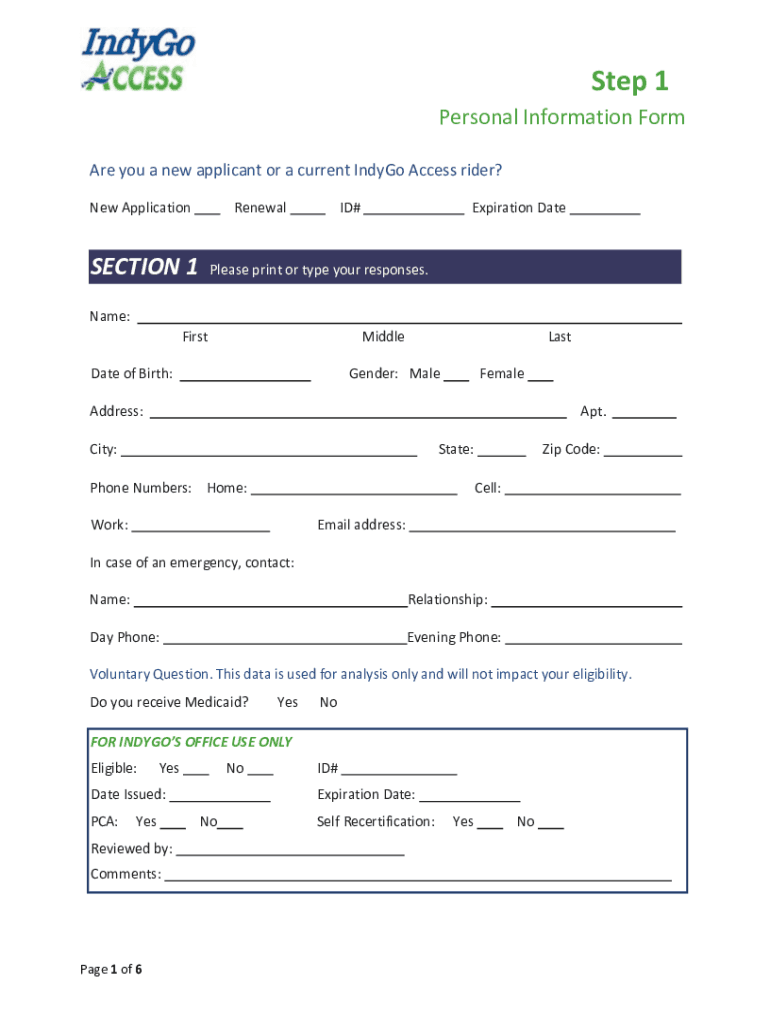 Step 1 Personal Information Form Are you a new applicant or a current IndyGo Access rider? New ApplicationRenewalSECTION 1ID#Expiration DatePlease print or type your responses.Name: FirstMiddleDate
