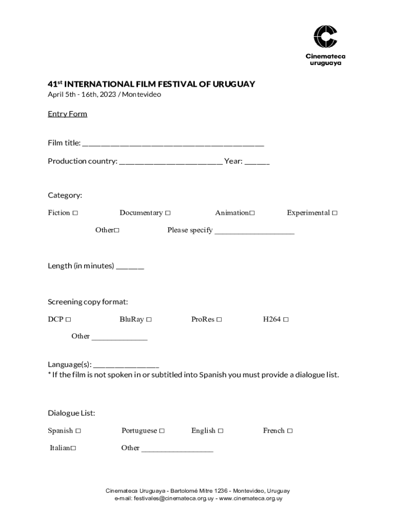 41st INTERNATIONAL FILM FESTIVAL OF URUGUAY April 5th 16th, 2023 / MontevideoEntry FormFilm title: ___ Production country: ___ Year: ___Category: Fiction Documentary OtherAnimationExperimental Please