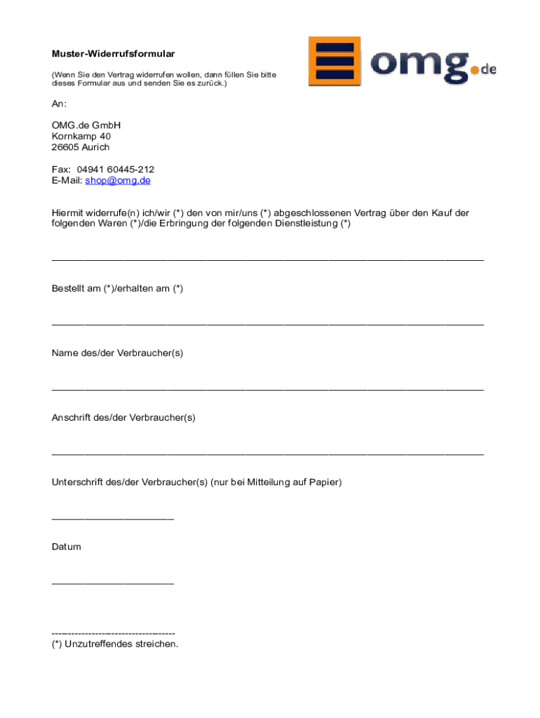 MusterWiderrufsformular (Wenn Sie den Vertrag widerrufen wollen, dann fllen Sie bitte dieses Formular aus und senden Sie es zurck.)An: OMG.de GmbH Kornkamp 40 26605 Aurich Fax: 04941 60445212 EMail: