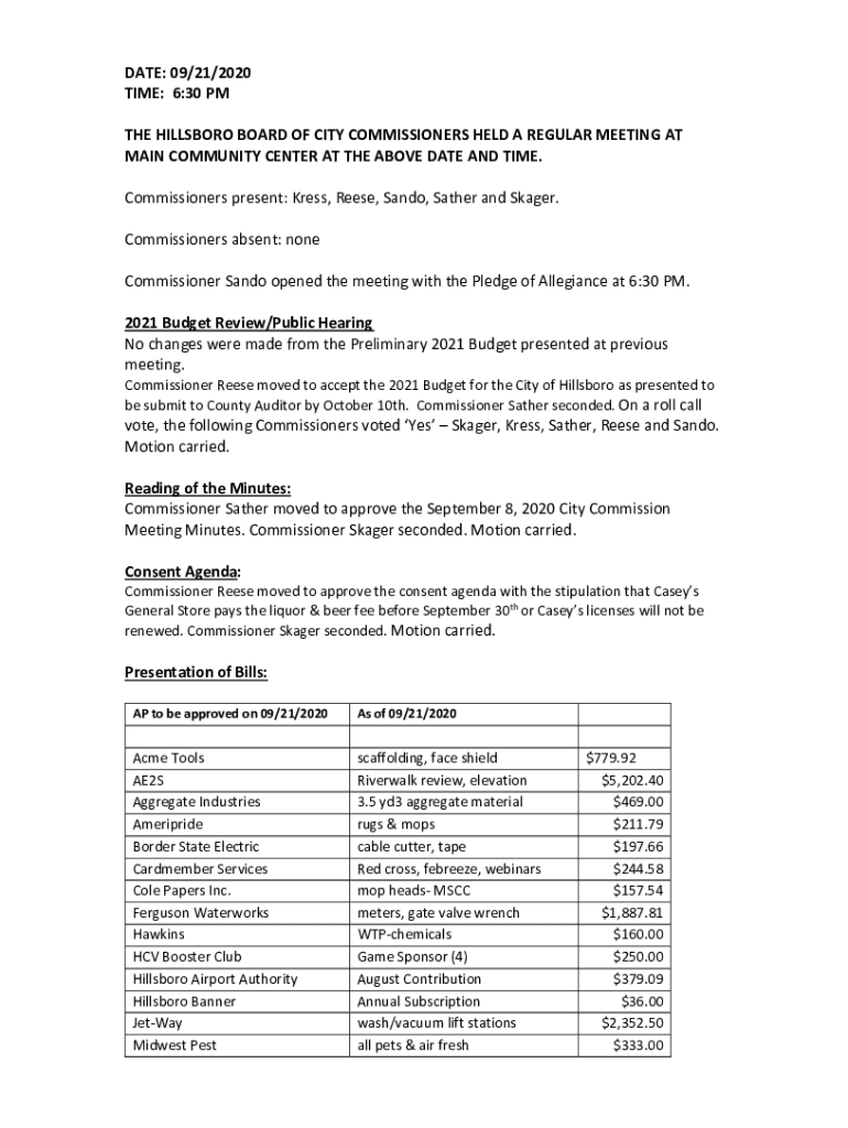 THE HILLSBORO BOARD OF CITY COMMISSIONERS HELD A REGULAR MEETING AT