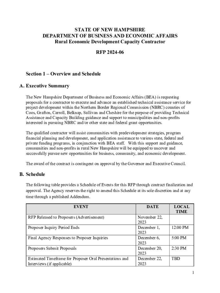 STATE OF NEW HAMPSHIRE DEPARTMENT OF BUSINESS AND ECONOMIC AFFAIRS Rural Economic Development Capacity Contractor RFP 202406Section 1 Overview and Schedule A. Executive Summary The New Hampshire Department