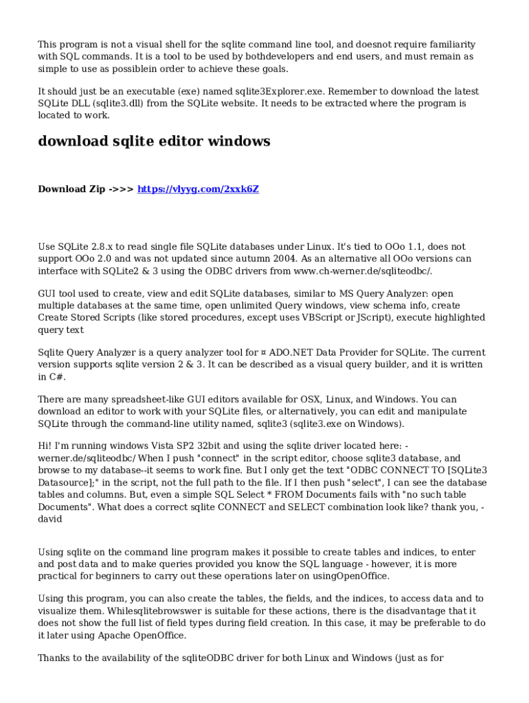 This program is not a visual shell for the sqlite command line tool, and doesnot require familiarity with SQL commands. It is a tool to be used by bothdevelopers and end users, and must remain as