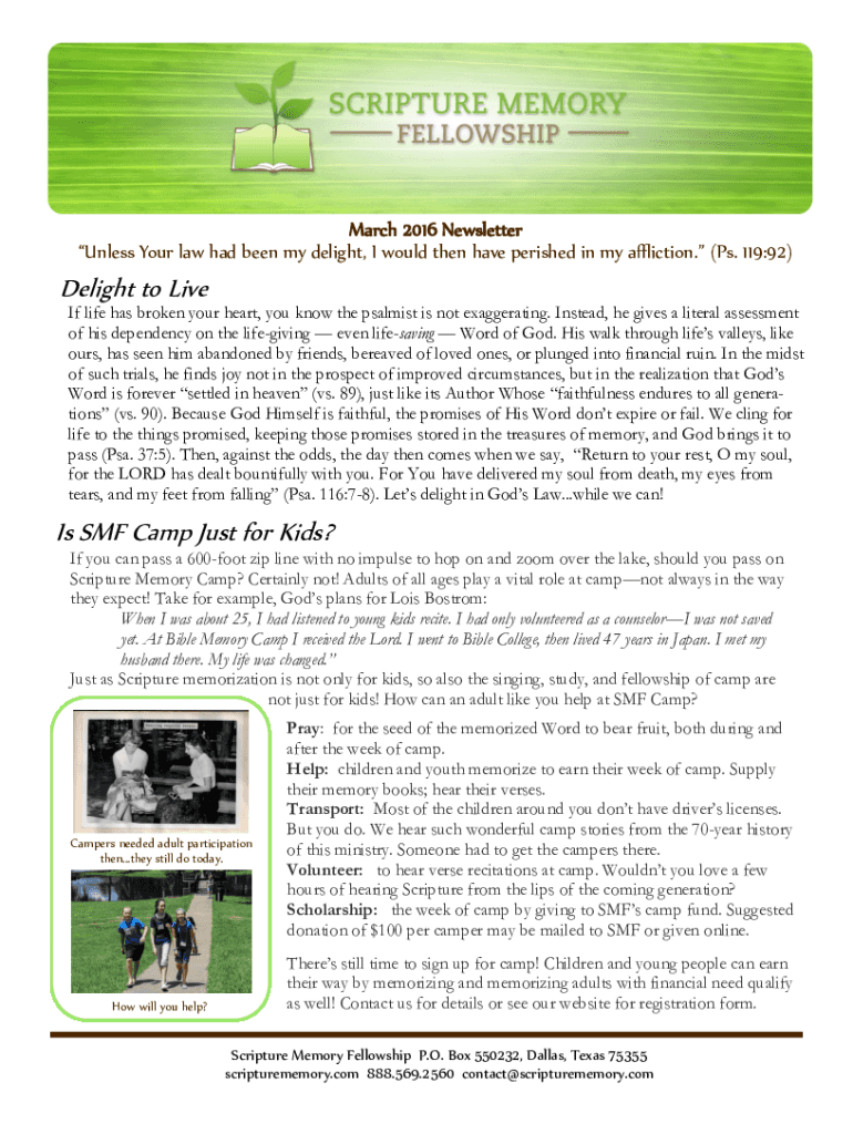 March 2016 Newsletter Unless Your law had been my delight, I would then have perished in my affliction. (Ps. 119:92)Delight to Live If life has broken your heart, you know the psalmist is not exaggerating.