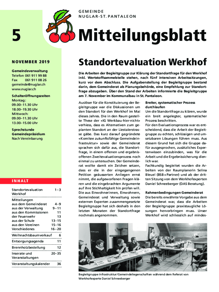 GEMEINDE N U G L A R S T. P A N TA L E O N5MitteilungsblattN OV E M BE R 2 0 1 9Standortevaluation WerkhofGemeindeverwaltung Telefon 061 911 99 88 Fax061 911 08 26 gemeinde@nuglar.ch www.nuglar.chDie