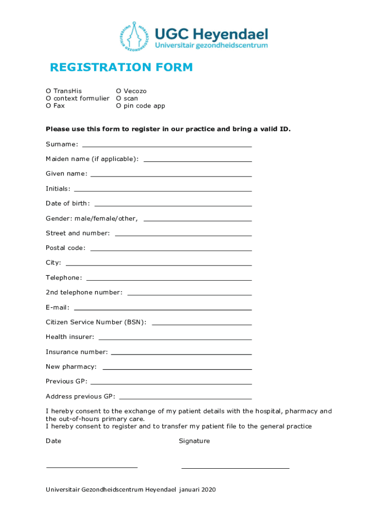 REGISTRATION FORM O TransHis O context formulier O FaxO Vecozo O scan O pin code appPlease use this form to register in our practice and bring a valid ID. Surname: Maiden name (if applicable): Given