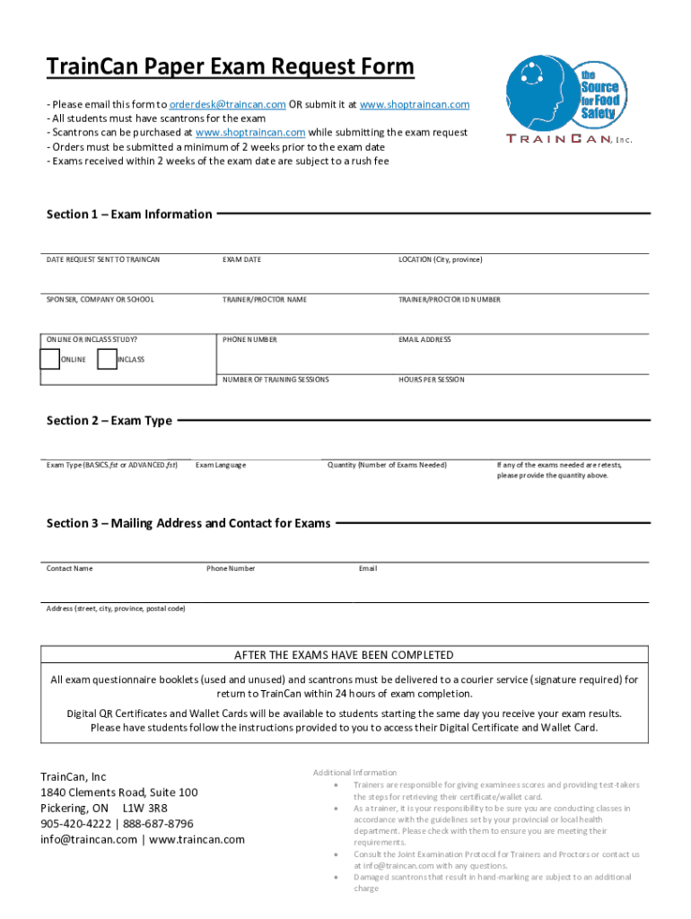 TrainCan Paper Exam Request Form Please email this form to orderdesk@traincan.com OR submit it at www.shoptraincan.com All students must have scantrons for the exam Scantrons can be purchased at www.shoptraincan.com