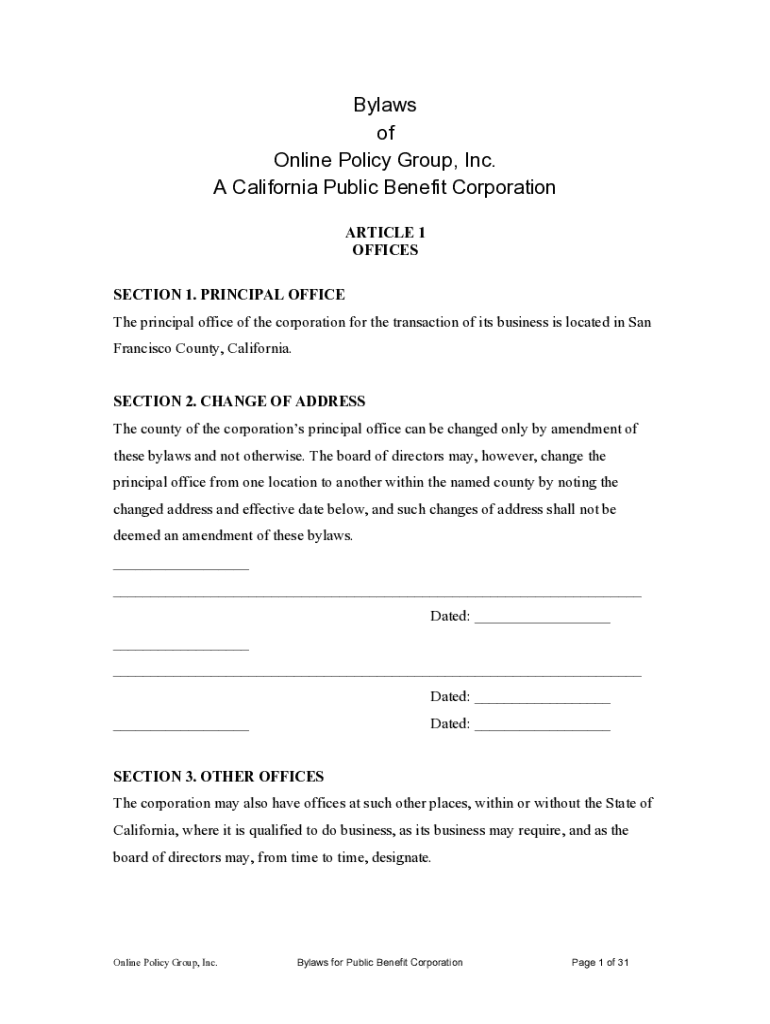 Bylaws of Online Policy Group, Inc. A California Public Benefit Corporation ARTICLE 1 OFFICES SECTION 1. PRINCIPAL OFFICE The principal office of the corporation for the transaction of its business
