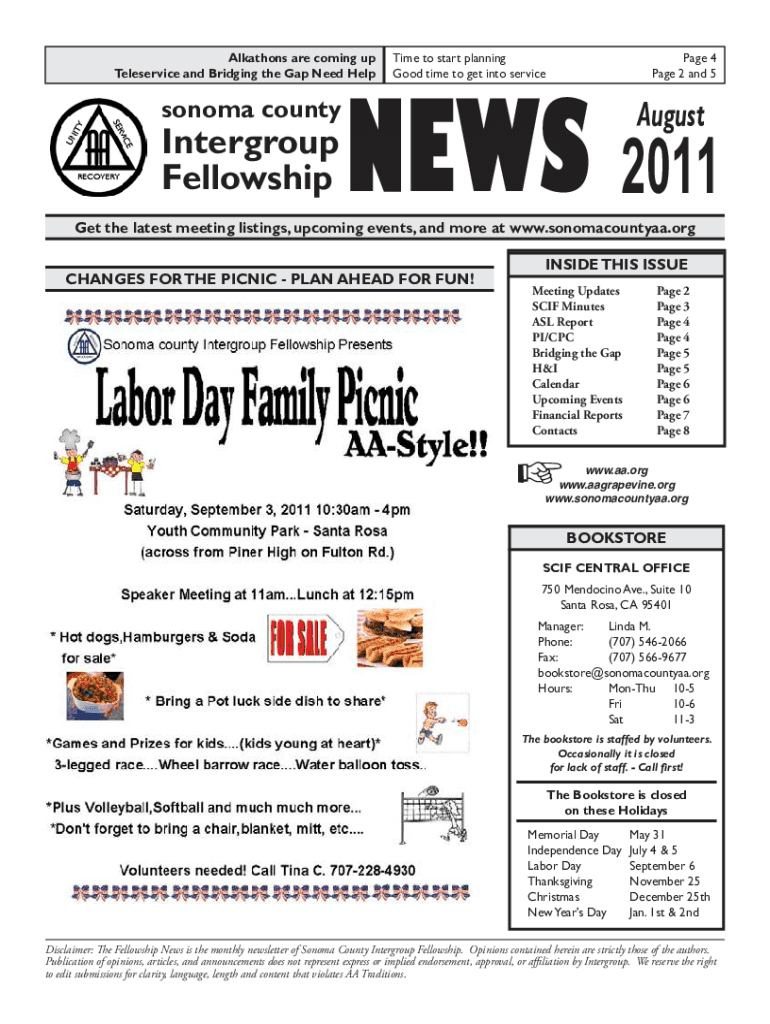 Alkathons are coming up Teleservice and Bridging the Gap need helpsonoma countyIntergroup FellowshipTime to start planning Good time to get into servicePage 4 Page 2 and 5AugustNEWS 2011Get the latest