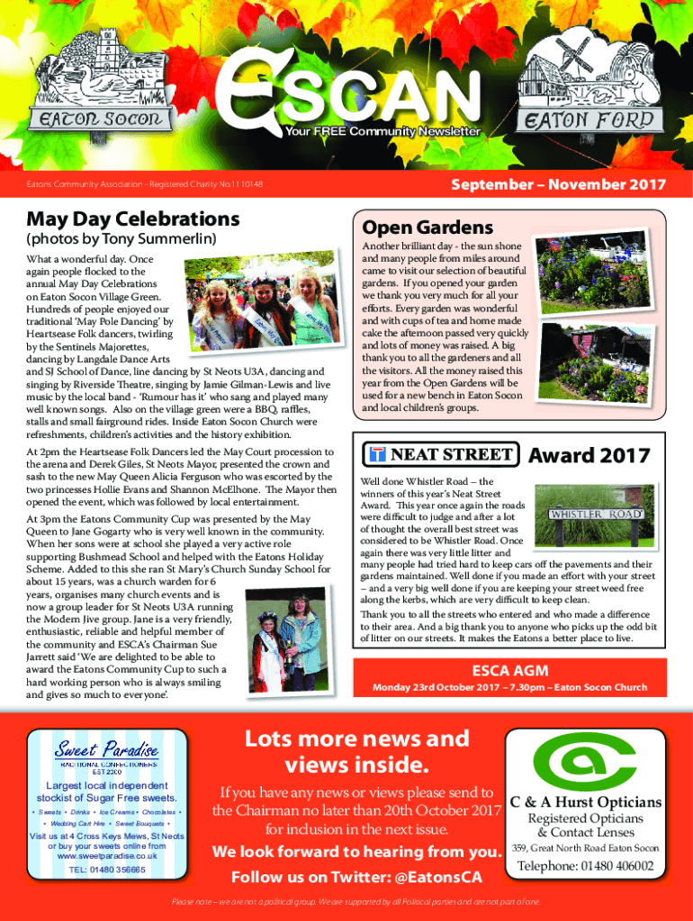 Your FREE Community NewsletterEatons Community Association Registered Charity No.1110148May Day CelebrationsSeptember November 2017Open Gardens(photos by Tony Summerlin)What a wonderful day. Once