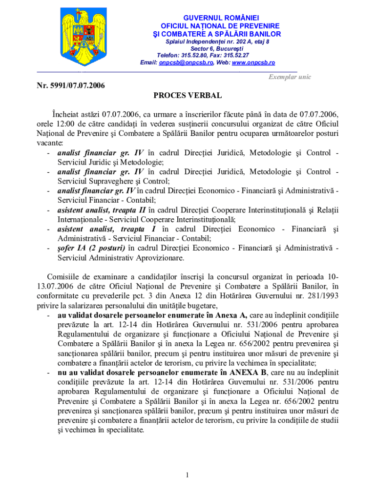 SGUVERNUL ROMNIEI OFICIUL NAIONAL DE PREVENIRE I COMBATERE A SPLRII BANILORSplaiul Independenei nr. 202 A, etaj 8 Sector 6, Bucureti Telefon: 315.52.80, Fax: 315.52.27 Email: onpcsb@onpcsb.ro, Web: