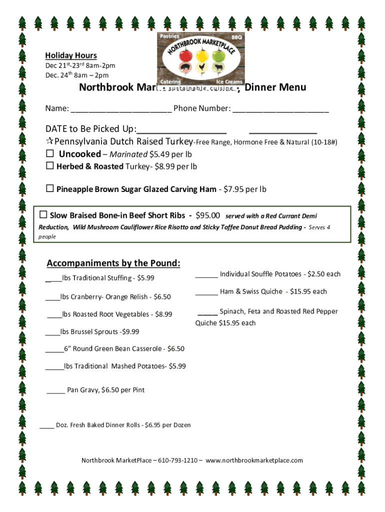 Holiday Hours Dec 21st23rd 8am2pm Dec. 24th 8am 2pmNorthbrook MarketPlaces Holiday Dinner Menu Name: ___ Phone Number: ___DATE to Be Picked Up: Pennsylvania Dutch Raised TurkeyFree Range, Hormone