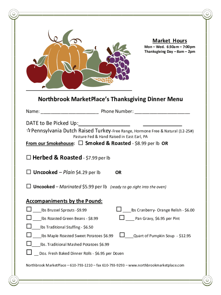 Market Hours Mon Wed. 6:30am 7:00pm Thanksgiving Day 8am 2pmNorthbrook MarketPlaces Thanksgiving Dinner Menu Name: ___ Phone Number: ___DATE to Be Picked Up: Pennsylvania Dutch Raised TurkeyFree Range,