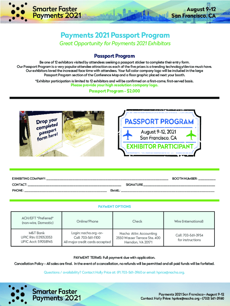 Payments 2021 Passport Program Great Opportunity for Payments 2021 Exhibitors Passport Program Be one of 12 exhibitors visited by attendees seeking a passport sticker to complete their entry form.