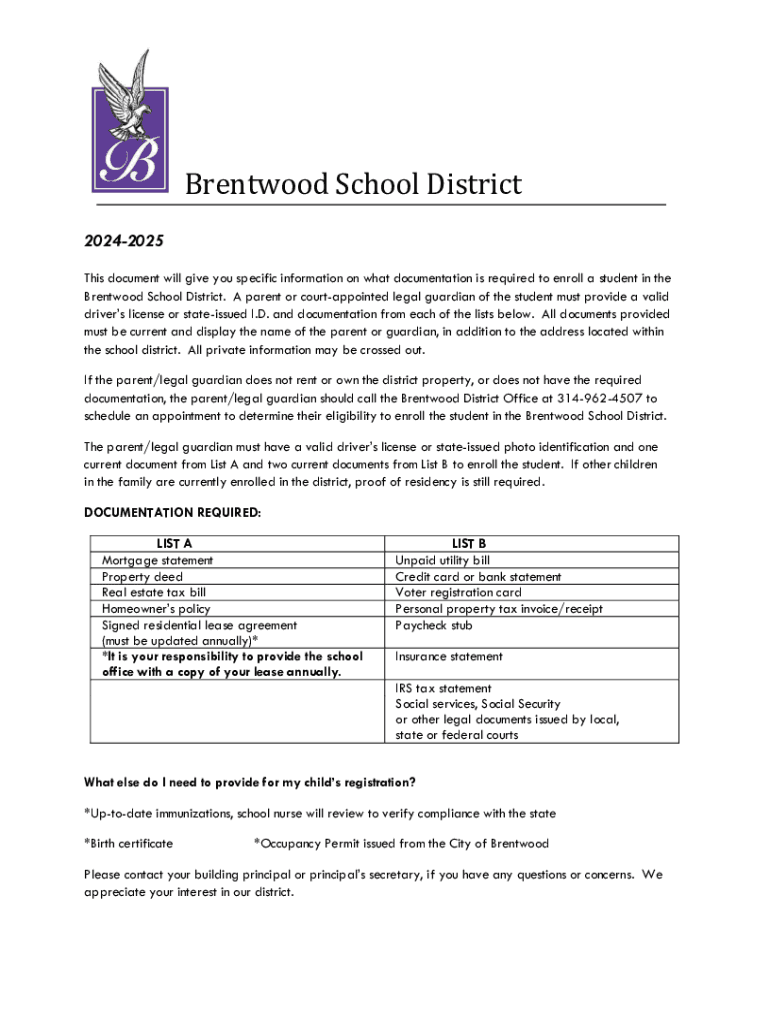 Brentwood School District 20242025 This document will give you specific information on what documentation is required to enroll a student in the Brentwood School District. A parent or courtappointed