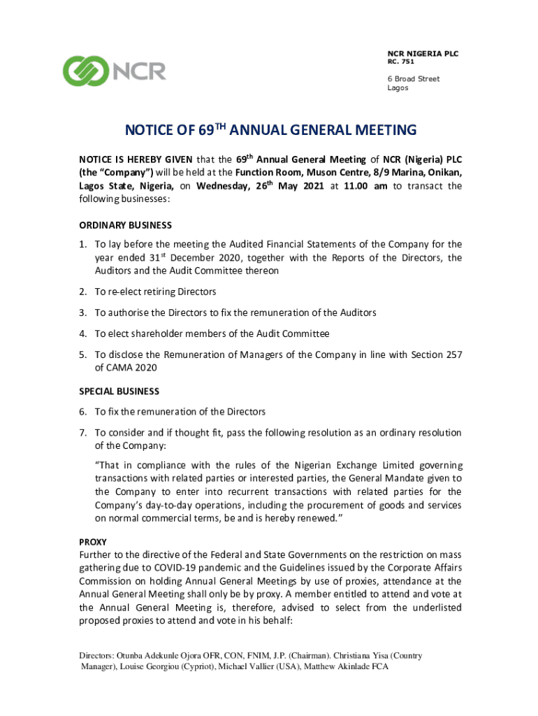 NOTICE IS HEREBY GIVEN that the 69th Annual General Meeting of NCR (Nigeria) PLC